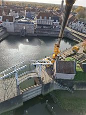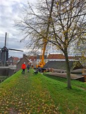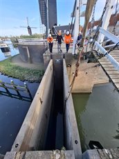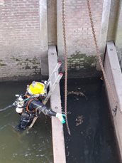 Een mooie samenwerking met onze partners zorgde voor een soepel verloop van de proefsluiting. De kraan werd veilig opgesteld en na een gezamenlijke veiligheidsbespreking met het kraanbedrijf en het duikteam gingen we van start. Vooraf inspecteerde het duikbedrijf de bodem, zodat we goed voorbereid aan de slag konden. Alles verliep volgens plan – en rond 15.00 uur reed de kraan weer de stad uit. Klus geklaard!