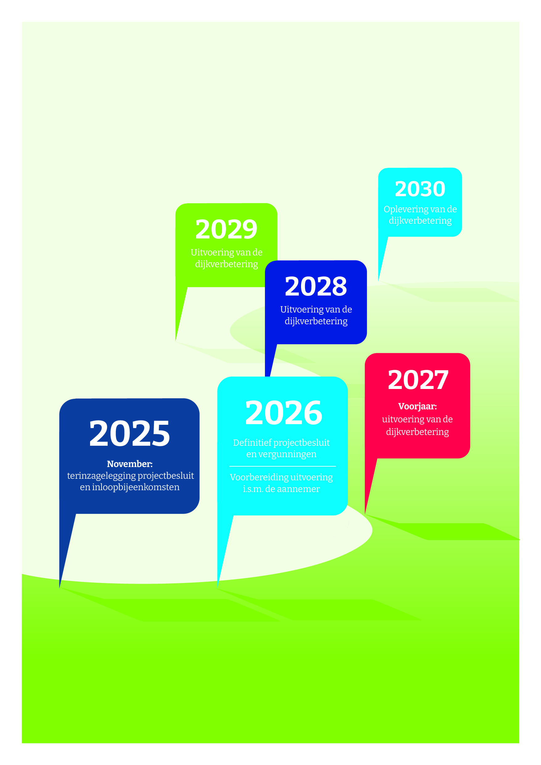 Op dit moment kunnen we nog niet precies zeggen wanneer de werkzaamheden aan de dijk starten en afgerond zijn. We verwachten dat we eind 2025 het projectbesluit ter inzage kunnen leggen. Daarna volgt de officiële goedkeuring en bereiden we de uitvoering verder voor. Het plan is dat de aannemer in de zomer van 2025 aan boord is. Naar verwachting starten we in de loop van 2027 met de werkzaamheden aan de dijk. De uitvoering zal ongeveer 3 jaar in beslag nemen. Deze wordt in deeltrajecten uitgevoerd. Er wordt dus niet overal tegelijk gewerkt en de planning hiervan is nog niet bekend.